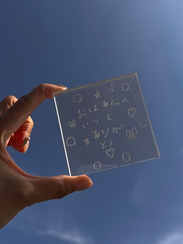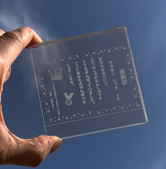 こども感謝状、表彰状 〜アクリルメッセージボード〜 皆様からのご希望の文面を、 アクリルボードに彫刻させて頂きます。 メッセージ内容をお教え頂きましたら、 アクリルボードに彫刻させて頂きます。 このアクリルボードはしっかりとした厚みがあり、 インテリアとして飾ることも可能です✨ 多彩な仕上がりが実現できるので、プレゼントとしても 喜ばれるアイテムです。 ※彫刻前に、お客様のご希望の文面を入れた イメージ写真をお客様がご納得いくまで お作りして写真を送らせていただきます。 ですので、ご注文の前にお問い合わせをお願い致します。 ■ サイズ (縦✖️横✖️厚さ) ・80mm×80mm×10mm ■ 素材 アクリル素材を使用しており、透明度が高く クリアな仕上がりを楽しめます。 ■ 取り扱い注意事項 高温の場所には置かないようにしてください。 ■ 発送・注文に関する情報や注意事項 ご注文後、通常1〜3営業日以内に発送いたします。 発送方法は追跡可能なサービスを利用し、 安心してお待ちいただけます。 ■ その他の情報や注意事項 完成した作品は耐久性のある素材で、長期間お楽しみいただけます。 お悩みやご不明点がございましたら、ぜひショップのお問い合わせからお気軽にご連絡ください。
