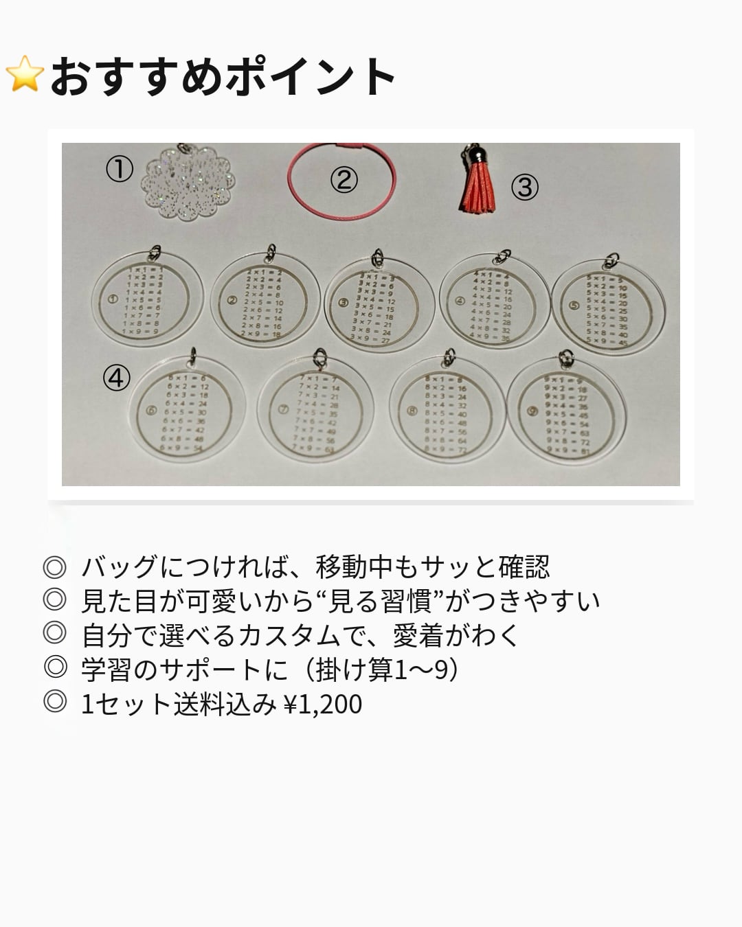 バッグやランドセルにつけて、いつでも見られる掛け算(1〜9)。